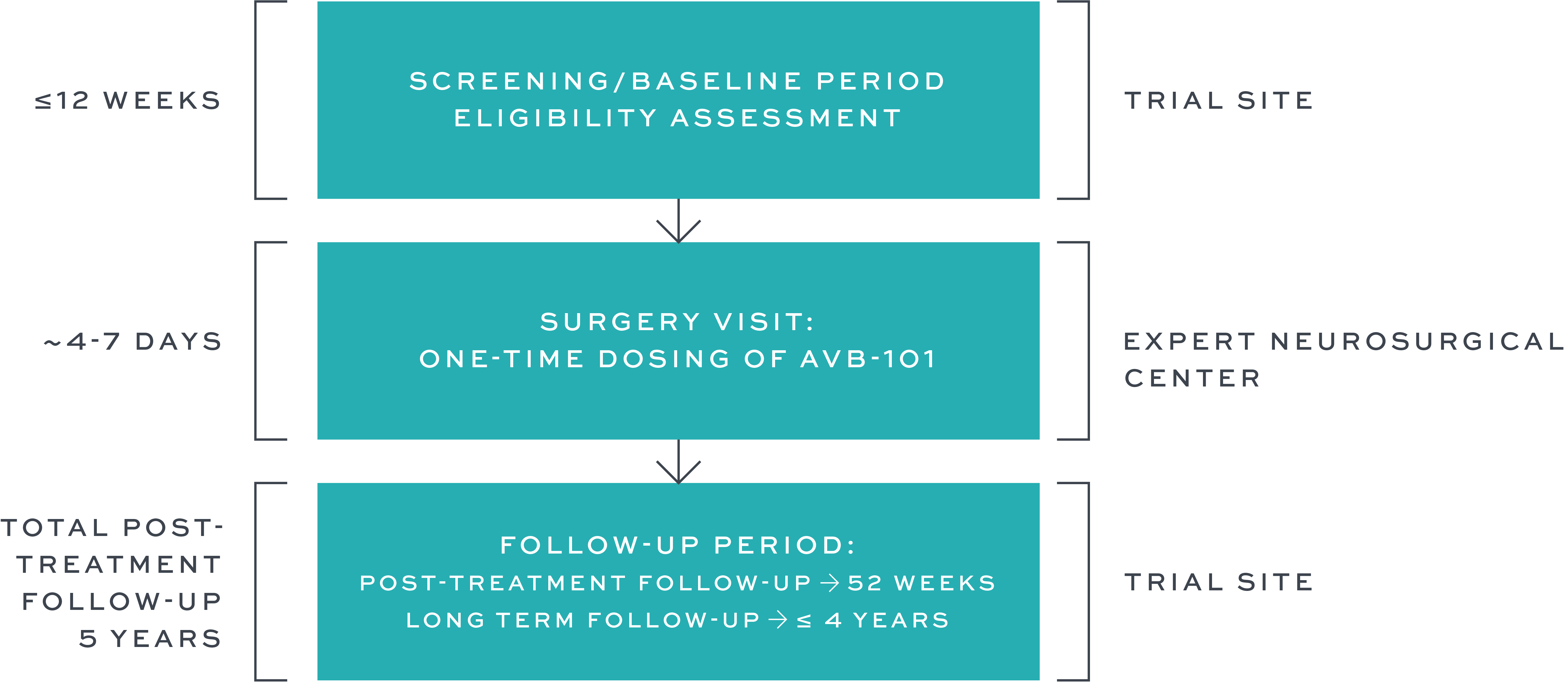 Study participation involves visiting a clinical trial site at different points during the study for screening and follow up, and visiting an expert neurosurgical site for one-time dosing of AVB-101.